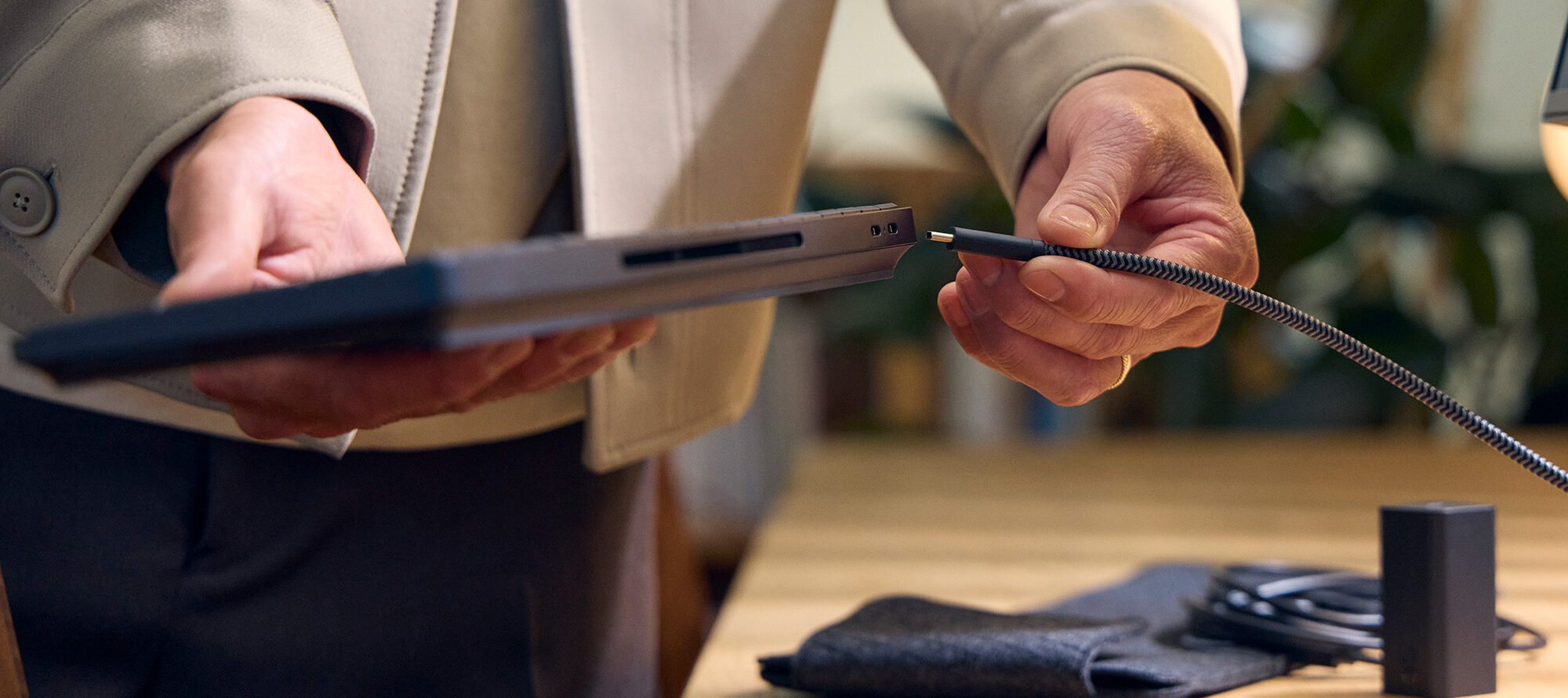 Tā kā datora korpusa augšējo daļu sedz klaviatūra, un apakšējo – dzesēšanas panelis, kamēr tās sānos ir iestrādāta ventilācijas atvere, skaļruņi un mikrofons, tajā ir iebūvēti tikai divi porti – USB4 Type-C 40Gbps un USB Type-C 10Gbps. Šie porti izmantojami iekārtas uzlādei, kā arī savienojumam ar monitoru vai HP HDMI Multiport Hub – EliteBoard komplektācijā iekļaujamu nelielu portu replikatoru, kas satur gan papildu USB-C portus, gan HDMI un RJ-45 portu. Dators atbalsta līdz pat četru monitoru pievienošanu visdažādāko darbvietas iekārtojumu izveidei.